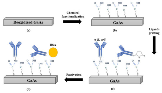 Schematic representation of the bio-functionalization stages: (a) bare and deoxidized GaAs surface, (b) MHDA/MUDO (1:9) chemical functionalization, (c) covalent immobilization of E. coli antibodies, (d) surface passivation with BSA and ethanolamine.