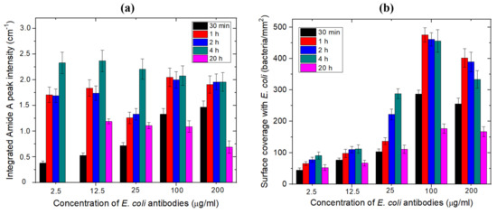 Consequently, the values of the amide A integrating absorbance intensity were determined for each antibody concentration and incubation time at fixed pH 7.4, by using a Lorentz fitting, and reported by histograms shown in Figure 4a. At low concentrations of antibodies, the highest integrated absorbance intensities were obtained when the samples were incubated in E. coli antibodies for 4 h. However, when the concentration was increased, the integrated absorbance intensity values were comparable for incubation times between 1 and 4 h. The relatively low values of the integrated absorbance intensities observed for the 20-h incubation suggest that the antibody molecules deteriorated over long incubation durations. Thus, these results suggest that the 1-h incubation is optimal for the immobilization at a high concentration of antibodies.