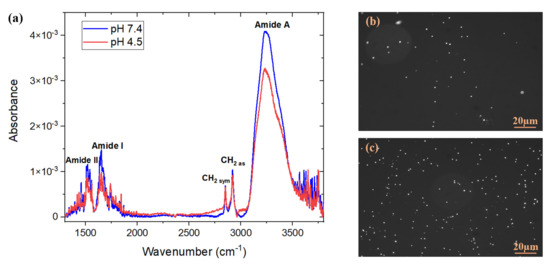 Examples of FTIR absorbance spectra measured after the immobilization of E. coli antibodies in PBS (pH 7.4) or acetate (pH 4.5), for the same concentration of 100 μg/mL and the incubation time of 1 h, are shown in Figure 5.