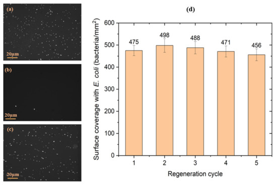 Examples of microscopic images of the antibody-functionalized GaAs biochips following the exposure to E. coli, the regeneration with a bacteria releasing kit and the repeated exposure to bacteria are shown in Figure 6. These results indicate the efficient bacterial removal and reproducible capture of bacteria after the regeneration. The initial capture of bacteria on the surface was at 475 ± 23 bacteria/mm2, and decreased to 10 ± 5 bacteria/mm2 following the removal step. After the second exposure to E. coli, the surface coverage increased to 498 ± 31, which is in agreement with the FTIR data that show increased intensity of antibody-related amide peaks following the exposure to acidic pH (Table 1). The density of captured bacteria remained in the limit of the error of the initial bacteria density, to finally reach 456 ± 27 bacteria/mm2 after the 5th exposure of the regenerated biochip to E. coli suspension. The evolution of the density of E. coli captured on the biochip surface is summarized in Figure 7d. These results clearly show the capacity of the investigated kit to regenerate the surface of the biosensor while preserving the efficiency of the biointerface for the capture of bacteria.