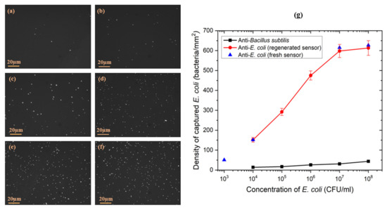 Figure 7g shows the evolution of the surface density of bacteria for the different tested concentrations of E. coli. The change in the bacterial surface coverage between E. coli concentrations of 107 and 108 CFU/mL was almost negligible, indicating that the sensor reached the saturation stage.