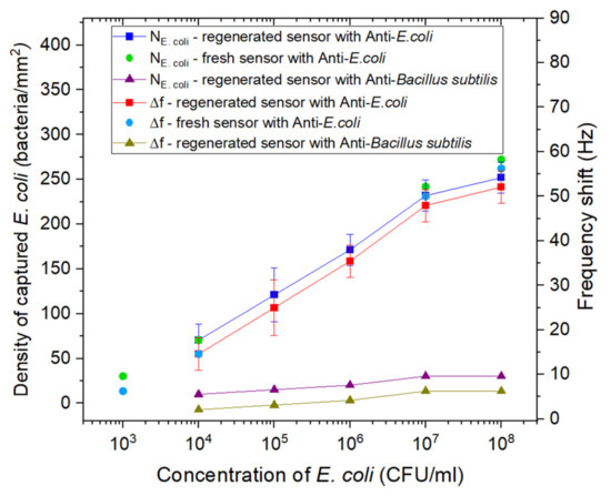 The recorded frequency shifts and density of E. coli captured after exposure of fresh and regenerated sensors biofunctionalized with E. coli antibodies or B. subtilis antibodies to different concentrations of E. coli suspensions are shown in Figure 8. The measurement range of the biosensor was between 103 and 108 CFU/mL, with a linear region (log scale) between 103 and 107 CFU/mL. The LOD of the biosensor was determined at 103 CFU/mL, and the curve representing the frequency shift Δf versus the logarithm of the concentration of E. coli can be described using the following relation: Δf (Hz) = 9.77 log [E. coli]–23.61.