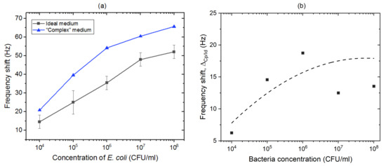 (a) Frequency shifts reported for the sensor exposed to increasing concentrations of E. coli in ideal medium (black squares), and E. coli in “complex” medium (blue triangles). (b) Difference between frequency shifts determined for E. coli in “complex” and ideal media (broken line is shown as a guide to the eye).