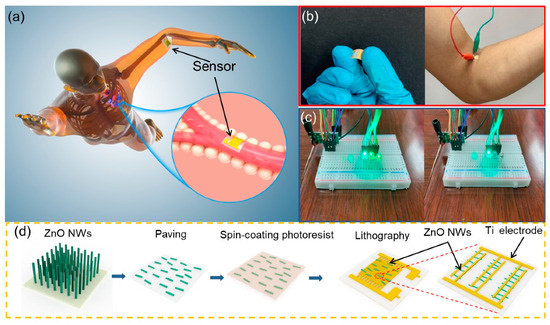 - Mao, Y.; Zhang, W.; Wang, Y.; Guan, R.; Liu, B.; Wang, X.; Sun, Z.; Xing, L.; Chen, S.; Xue, X. Self-Powered Wearable Athletics Monitoring Nanodevice Based on ZnO Nanowire Piezoelectric-Biosensing Unit Arrays. Sci. Adv. Mater. 2019, 11, 351–359. [Google Scholar] [CrossRef]