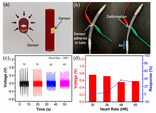 Photo of simulated arterial biosensor and characterization of output piezoelectric voltage. (a) Simulation of arterial work and biosensor attachment position. (b) Arterial model. (c) Output piezoelectric voltage of the arterial model monitored by biosensor. (d) Output piezoelectric voltage response.