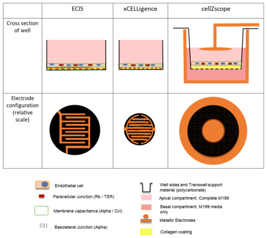 The electrode arrays used most widely in the ECIS (96W20idf plate), xCELLigence (E-plate) and cellZscope instruments differ in their electrode configuration. Both the ECIS and xCELLigence electrodes have a similar interdigitating electrode configuration, which covers a high proportion of the bottom of the well. Hence, their electrodes are directly coated with collagen and in intimate contact with the endothelial cells. In contrast, one of the cellZscope electrodes lines the lower compartment of the Transwell, whilst the second is suspended above the cell monolayer. Therefore, these electrodes are not in direct contact with the endothelial cells.