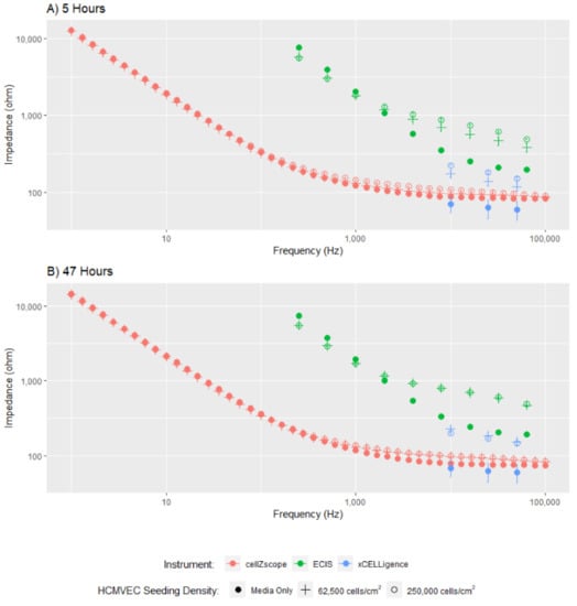 The dataset in Figure 2 also provides some insight into the temporal changes in impedance for the cells assessed using each of these three instruments. At the 5-h time point, there is a clear difference in impedance between the two cell seeding densities, however, at 47 h this difference is no longer apparent. This is because endothelial cells rapidly proliferate until they come into contact with neighbouring cells and form a monolayer, at which point proliferation slows and a mature monolayer forms [27]. By 47 h, the cells seeded at the lower density had sufficient time to proliferate and form a monolayer similar to the monolayer formed earlier by the cells seeded at a higher density.