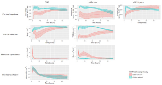Temporal profile of impedance and modelled endothelial barrier properties of hCMVECs monitored over 48 h by ECIS, cellZscope and xCELLigence instruments. hCMVECs were initially seeded at either 62,500 cells/cm2 or 250,000 cells/cm2 and incubated for 48 h until confluent. Ribbon plots show the mean ± SEM of three independent experiments, each of which was conducted in triplicate.