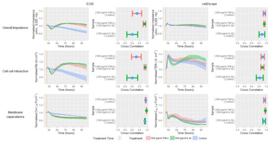 Next, each system’s capacity to detect temporal cellular changes in response to a biological stimulus was tested by treating, the confluent cell monolayers formed at 48 h with the proinflammatory cytokines TNFα and IL1β (Figure 4). The impedance data presented in Figure 4 has been normalized at one hour before treatment and is presented as a change in impedance, to allow direct comparisons between the instruments to be made. Finally, cross-correlation analysis was conducted between each treatment for all instruments; this analysis will test each instrument’s ability to discern between different temporal response profiles by comparing the curve shapes.