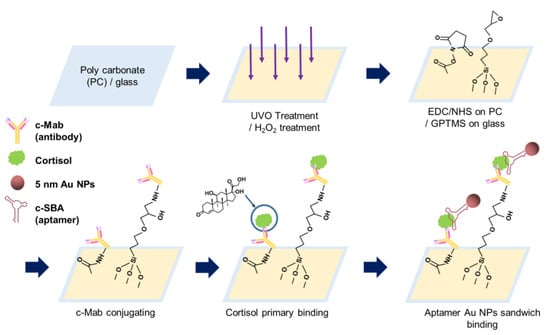 Schematic process diagram of cortisol antibody and aptamer sandwich assay on PC and glass substrate.