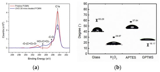 (a) XPS spectra of C 1s of pristine PC and UVO-treated PC; (b) contact angle analysis depending on surface-modified states of glass.
