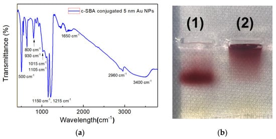 (a) FTIR spectra of c-SBA-conjugated 5 nm Au NPs; (b) 1.5% agarose gel electrophoresis image of (1) aptamer-conjugated 5 nm Au NPs and (2) pristine 5 nm Au NPs.