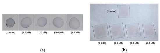 (a) Photograph images of PC colorimetric assay taken after six months: control, 1.0 pM, 10 pM, 100 pM, and 1.0 nM; (b) photographic images of glass colorimetric assay: 1.0 pM, 1.0 nM, and 1.0 μM.
