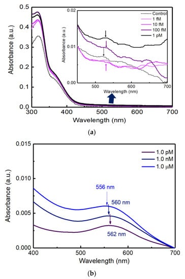 As shown in Figure 5a, the control, 1.0 fM, and 10 fM samples could show small peaks at the 520 nm absorbance peak. However, 100 fM and 1.0 pM samples could show higher absorbance and shifted peaks from the 520 nm [1]. From the data in Figure 5a, the limit of detection (LOD) of cortisol could be defined as 100 fM. In addition, there were no distinct aggregations that were frequently detected as a shoulder peak in the UV-Vis extinction spectra around 700~800 nm.