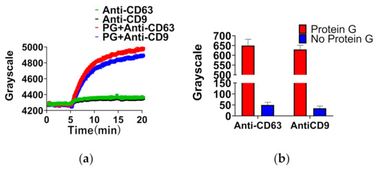 Protein G was utilized to improve ligand quantity in order to enhance the ligand detection signal. As shown in Figure 2a, the sensing signal of anti-CD63 or anti-CD9 with protein G was significantly improved. As shown in Figure 2b, comparing the red and blue bars, the increment in anti-CD63 (650 ± 40) or anti-CD9 (640 ± 20) with protein G is at least twelve times that of anti-CD63 (50 ± 10) or anti-CD9 (40 ± 10) without protein G. These results indicated that protein G enhanced the amount of anti-CD9 or anti-CD63 adsorption. On the one hand, protein G is a bacterial cell wall protein isolated from group G Streptococci [32]. DNA sequencing of native protein G identified two IgG-binding domains and sites for albumin [32]. On the other hand, anti-CD9 and anti-CD63 have two IgG-binding domains because these proteins are the isotype of IgG1. Therefore, protein G has the ability to bind anti-CD9 or anti-CD63 selectively.