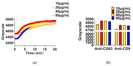The amount of absorption of exosomes depends on the number of antibodies on the sensing surface. Therefore, a proper concentration (saturated concentration) of antibody is necessary. The concentration of antibodies was diluted in four levels, 10 μg/mL, 20 μg/mL, 40 μg/mL, and 80 μg/mL by PBST. The real-time curve of antibody adhesion is shown in Figure 3a. As shown in Figure 3b, the concentration of 20 μg/mL produced the highest sensing signal for both anti-CD9 and anti-CD63. However, the detection signal did not increase as the concentration increased. One the one hand, too low a concentration of antibody (10 μg/mL) may bring exosomes into direct contact with the surface because of the large number of virgin sites on the surface. On the other hand, too high a concentration of antibody (80 μg/mL) may reduce the number of exosomes on the surface due to the appearance of steric hindrance [33]. Therefore, the concentration of 20 μg/mL of anti-CD9 or anti-CD63 is not only the saturated adsorption concentration on the sensing surface, but was also employed as the normal concentration in the follow-up experiment.