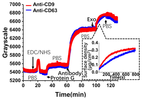 The whole real-time procedure of exosome adhesion was recorded by TIRIE. As shown in Figure 4, EDC/NHS was pumped into the flow cell in the first 20 min. After washing with PBS, protein G was immobilized on the activated surface at a concentration of 100 μg/mL for a further 30 min. Antibodies (anti-CD9 or anti-CD63) were injected on the sensing surface during the next 20 min. After washing with PBS, exosomes at a concentration of 200 μg/mL were delivered to the surface within 15 min. For protein G, the grayscale increased by 200. Antibodies showed an increase of 900 grayscale. Finally, for exosomes, the grayscale increased by 300. In fact, TIRIE responded approximately linearly to the variation in surface mass density (μg/cm2) of the protein layer [34]. The relationship between the TIRIE signal, , and the surface mass density of the protein layer, , can be given by