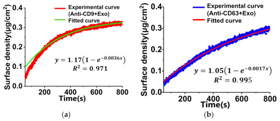 where is the initial surface density of the ligand before the interaction, is the dissociation equilibrium constant of the interaction, and is the concentration of the analyte in solution. As shown in Figure 5, the square numbers (R2) of two curves are greater than 0.97, suggesting that an appropriate degree of the pseudo-first-order interaction model curves is consistent with the experimental curves. In terms of Equation (2), the yellow curve in Figure 5a has a larger A1/A2 than the red curve in Figure 5b. According to Equations (1) and (3), a higher leads to a lower , and a smaller suggests a stronger binding affinity between ligand and analyte [34]. As shown in Figure 5, the red curve (anti-CD9) has a greater surface density than the blue curve (anti-CD63). Therefore, the interaction between anti-CD9 and exosomes has a stronger binding affinity than the interaction between anti-CD63 and exosomes.