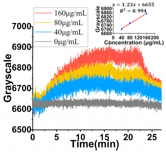 In order to verify the detection range (concentration) of exosomes in TIRIE, three different concentrations of exosomes (40 μg/mL, 80 μg/mL, 160 μg/mL) were considered as targets. Since the interaction between the anti-CD9 and exosomes showed a higher affinity for binding, anti-CD9 was employed as a ligand in this part. As shown in Figure 6, as the exosome concentration increases, the TIRIE signal increases steadily. The TIRIE signal changes from 100 grayscale to 250 grayscale. According to the calibration curve from the Figure 6 inset, the LOD of TIRIE is 0.41 μg/mL assuming a 95% confidence level. The calculation of LOD is based on the calibration curve with S/σ = 3.3, where S and σ are the slope of the calibration curves of exosomes (Figure 6 inset) and the standard deviation of 20 independent blank control measurements, respectively.