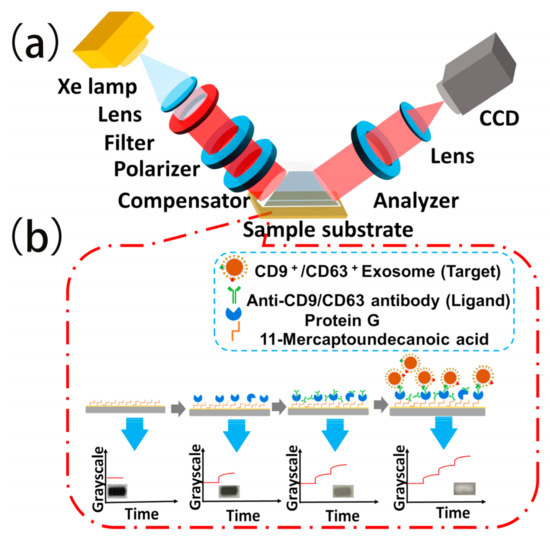 TIRIE for the detection of exosomes: (a) Schematic of TIRIE with the typical conventional polarizer–compensator–sample–analyzer configuration; (b) schematic of the bioreaction process on the sensing surface and the sensing signals recorded by TIRIE, correspondingly. The grayscale image shows the intensity of the light which is characteristic of the surface mass density distribution of the biomolecular layers on the surface. When the ligand in the solution interacts with the target, a complex is assembled on the surface by affinity and the surface mass density is changed. With the visualization by TIRIE, the changes on the surface are be transformed into grayscale and the targets in the solution can be verified quantitively.