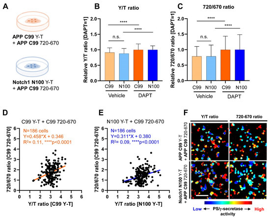 Co-recording of APP C99 and Notch1 N100 processing by PS/γ-secretase on a cell-by-cell basis in live cells: (A) A schematic presentation of the experimental conditions. The APP C99 720-670 biosensor was co-transfected with either the APP C99 Y-T or Notch1 N100 Y-T biosensor in CHO cells; (B) CHO cells co-expressing the C99 720-670 with C99 Y-T biosensors or those with the N100 Y-T biosensors were treated with 1 μM DAPT (PS/γ-secretase inhibitor) or vehicle control for 16 h. Y/T ratios in the cells expressing the C99 Y-T biosensor were normalized to those in the corresponding DAPT-treated cells and similarly done for the cells expressing the N100 Y-T biosensors to calculate relative Y/T ratios, which indicate the processing efficiency of the reporter probe by PS/γ-secretase. The relative Y/T ratio was not different between the cells co-expressing the C99 720-670 with C99 Y-T biosensor and those with the N100 Y-T in vehicle-treated condition. n = 186–188, one-way ANOVA, n.s. not significant, **** p < 0.0001; (C) In accordance, relative 720/670 ratios remained largely unchanged in the presence of either C99 Y-T or N100 Y-T biosensors, suggesting that the C99 720-670 biosensor was equally processed by PS/γ-secretase in these cells. n = 186–188, one-way ANOVA, n.s. not significant, **** p < 0.0001; (D) Scatterplots of 720/670 and Y/T ratios in the cells expressing the C99 720-670 and C99 Y-T biosensors (Pearson correlation coefficient, n = 186, Y = 0.458X + 0.346, R2 = 0.11, **** p < 0.0001) or (E) those with the C99 720-670 and the N100 Y-T biosensors (n = 186, Y = 0.311X + 0.380, R2 = 0.09, **** p < 0.0001). (F) Pseudo-colored images of Y/T ratio and 720/670 ratio: cells with higher and lower PS/γ-secretase activity are shown in red and blue, respectively.