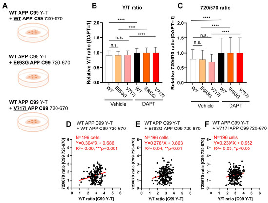Simultaneous monitoring of WT and FAD-linked mutants APP C99 processing by PS/γ-secretase: (A) Schematic representation of the experimental groups: the WT APP C99 Y-T biosensor was co-transfected into CHO cells in combination with the WT or FAD mutant C99 720-670 biosensors; (B) The relative Y/T ratio was comparable among three groups, suggesting that the C99 Y-T biosensor was equally processed in the presence of WT or FAD mutants C99 720-670 biosensors. n = 196, one-way ANOVA, n.s. not significant, **** p < 0.0001; (C) Similarly, relative 720/670 ratio was not different between WT versus mutants C99 720-670 biosensors expressing cells. n = 196, one-way ANOVA, n.s. not significant, **** p < 0.0001. Scatterplots of 720/670 and Y/T ratios in the cells expressing the C99 Y-T biosensor together with the WT C99 720-670 (n = 196, Y = 0.304X + 0.686, R2 = 0.06, *** p < 0.001) (D); the E693G C99 720-670 (n = 196, Y = 0.278X + 0.863, R2 = 0.04, ** p < 0.01) (E); or the V717I C99 720-670 biosensor (n = 196, Y = 0.230X + 0.952, R2 = 0.03, * p < 0.05) (F). Pearson correlation coefficient squared demonstrates a positive correlation between the Y/T ratio (representing the C99 Y-T processing) and 720/670 ratio (cleavage of the wild-type or FAD mutants C99 720-670).
