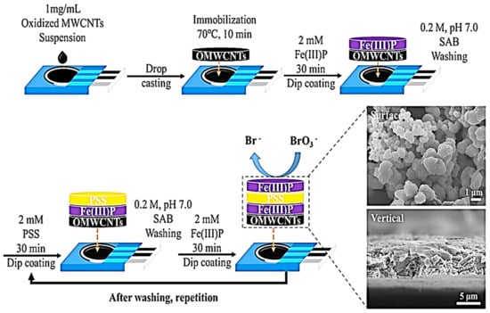 Through a layer-by-layer (LBL) method of sensor fabrication, Yong-Gu and his team [] assembled polyelectrolyte (polystyrene sulfonate, PSS), metalloporphyrin (FeP) and CNTs on screen-printed carbon electrode (SPCE) as shown in Figure 1. Using AP, LDR and LOD of 100 nM–2.5 µM and 43 nM respectively, were obtained. The authors were able to establish the fact that the LBL sensor is capable of rapid and selective BrO3− detection in water samples. The electrode showed a good selectivity for BrO3− in the presence of interferents (Mg2+, Ca2+, Na+, SO42−, Cl− and ClO4−), except HCO3− that showed a noticeable interference effect. In comparison, this result has a better LOD than that in [] using the same sensor material.