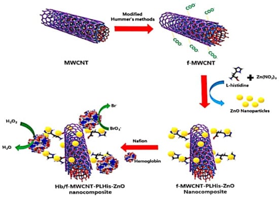Schematic representation of the preparation of Hb/f-MWCNT–P-l-His–ZnO-modified electrode for the development of the bromate and H2O2 biosensor (adapted from [] with permission).