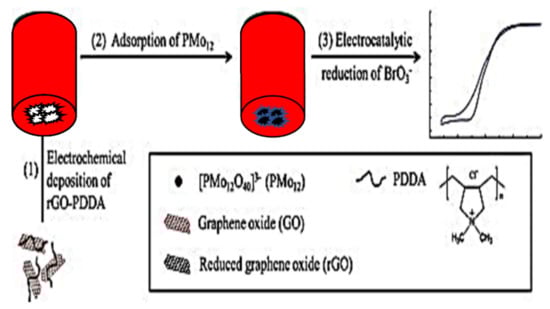 Ding et al. [] presented a BrO3− sensor made by the further modification of rGO-modified GCE with phosphomolybdate (PM) and poly(diallyldimethylammonium chloride) (PDDA). The process of fabricating rGO-PDDA/PMo12/GCE modified electrode involved three steps as illustrated in Figure 3. The stability of the electrode hinged on the electrostatic attraction between the cationic PDDA and the negatively charged PM. With CV, the electrocatalytic activity of the electrode towards BrO3− reduction and its stability were established. This electrode had a wide LDR (0.02–10 µM) with high sensitivity (454 µA cm−2 mM−1). The same PDDA/PMo12 was also used by Pang and his group [], but with a better result for LOD (20 nM).