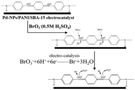Schematic representation of the proposed electrocatalytic reduction process of BrO3 at the Pd-NPs/PANI/SBA-15 interface (adapted from [] with permission).