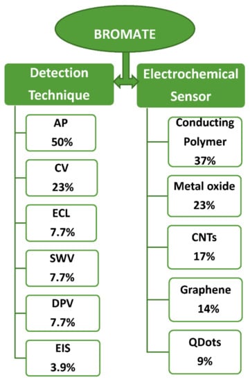 Various electroanalytical techniques such as AP, CV, ECL, DPV and SWV have been deployed for BrO3- detection as shown in Figure 6, with AP and CV been mostly used while EIS having the least. These techniques have been able to achieve the level of sensitivity and detection limit required for analysis of trace amounts of BrO3−, but the fact that EIS has not been utilized as much as these other techniques demands attention. Specifically, only one instance where EIS was used for BrO3− was found in the literature (to the best of our knowledge) (Table 2).