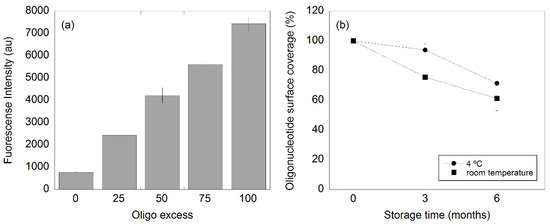 (a) Fluorescence intensity with respect of the oligo/nanoparticle ratio used in the nanoparticle functionalization and (b) oligo detachment from the nanoparticle surface over time (three and six months). The particles were stored at either room temperature or in the fridge at 4 °C.