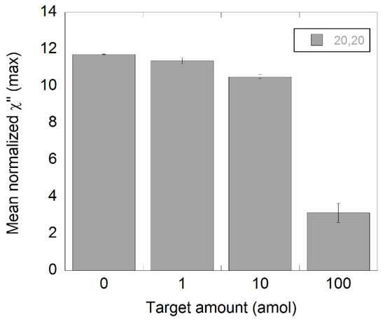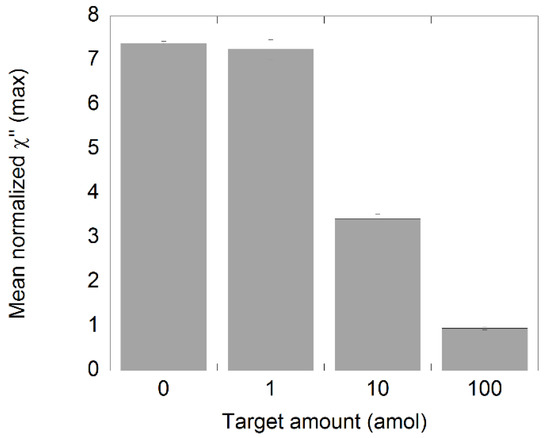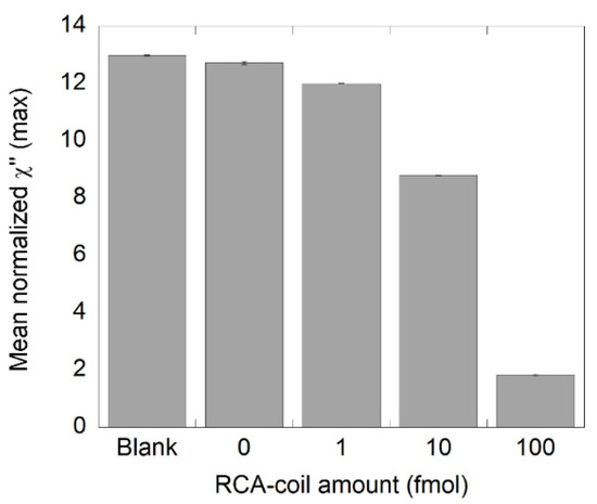 The χ”max values of samples containing different amounts of NDV RCA products (1, 10, and 100 fmol) are presented in Figure 2. These values were obtained from the imaginary part of the complex susceptibility curves displayed in Figure S1. As expected, the normalized χ”max value decreased with increasing amount of RCA products, indicating that the number of bound nanoparticles increased when a sample contained more RCA products. These results show that it is possible to differentiate a sample containing 1 fmol of RCA products from its NC using an RCA time of 60 min, which is in good agreement with previous studies [21,22]. Moreover, there is no significant difference between the NC sample and the blanks (suspended nanoparticles in PBS), which ensures that there is unspecific binding of the MNPs in the NC and it can therefore be a reliable NC sample.