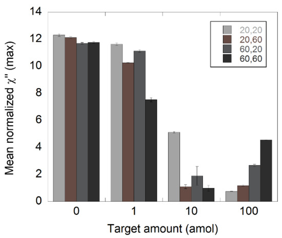 Three NDV target amounts (1, 10, and 100 amol) and a NC sample with no NDV target were analyzed. The target was diluted in steps of 1:10 and processed according to the C2CA protocol as described in the Materials and Methods section. The two amplifications steps were conducted for either 20 or 60 min in order to understand how the amplification time influences the performance of the assay. Four different types of samples were analyzed, on the basis of their amplification times, namely, 20′+20′, 20′+60′, 60′+20′, and 60′+60′, where the first number indicates the amplification time in first amplification step and the second number indicates the amplification time in the second amplification step. The results are presented in Figure 4 where the mean normalized χ”max values at 145 Hz are plotted as a function of DNA target amount. The 145 Hz frequency corresponded to the Brownian relaxation peak of the unbound nanoparticles. All χ”max values are extracted from the magnetization spectra in Figures S2–S5.