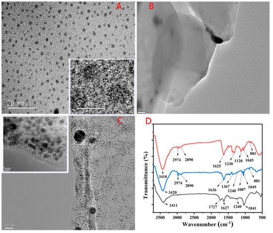Characterization of His@AuNCs, GO, andHis@AuNCs/GO, respectively. (A) TEM of His@AuNCs, (B) TEM of GO, (C) TEM of His@AuNCs/GO, (D) FT-IR spectra of GO (black), His@AuNCs (red) and His@AuNCs/GO (blue). Insert in (A), (C) show HR-TEM of His@AuNCs and His@AuNCs/GO, respectively.