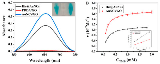 In our recent work, the oxidase mimic activity of His@AuNCs was studied by the catalytic oxidation of the substrate TMB [37]. In this work, the oxidase-like activity of the His@AuNCs loaded onto PDDA/GO was investigated. As shown in Figure 2A, compared with the His@AuNCs-TMB system, a visible color change was observed in the His@AuNCs/GO-TMB system (inset of Figure 2A). This result was also evidenced by the UV–vis absorption spectrum at 652 nm. The results indicated that His@AuNCs/GO has an oxidase-like activity. We further studied the catalytic properties of His@AuNCs/GO through steady-state kinetic experiments.