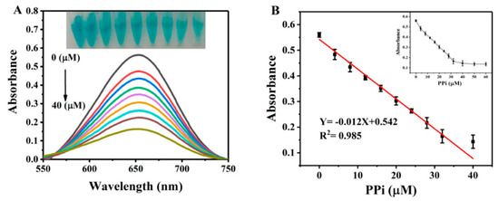 (A) The UV–vis absorption spectra of the His@AuNCs/GO-TMB system in the presence of various concentrations of PPi. Inset shows the photos of the corresponding solutions. (B) Linear relationship for PPi detection. Absorbance changes with the increase of PPi concentration from 4 to 60 μM (inset). Error bars represent the standard deviations (n = 3).