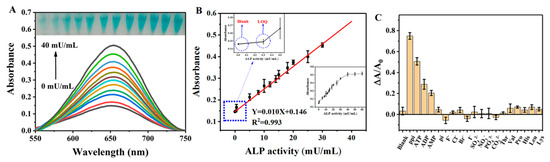 ALP is frequently utilized as an enzyme label in biochemical assays, such as the enzyme-linked immunosorbent assay (ELISA) [7]. Therefore, simple, sensitive, and reliable assays are highly desirable in the detection of ALP activity in the research and diagnosis of diseases [8,9,10]. Several conventional methods are typically used for ALP activity determination, such as electrochemistry [11,12], fluorometry [13,14], colorimetry [15,16], etc.