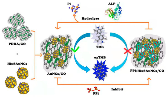 According to the previous reports about nanozymes, in the presence of reducing agents, TMB is less effectively oxidized, which may be due to different mechanisms—namely, reducing oxTMB to colorless TMB [44,45,46]. To clearly explain the inhibitory behavior of PPi, we explored whether PPi can reduce oxTMB. Figure S8 shows the absorbance at 652 nm when PPi is added to the His@AuNCs/GO-TMB system after 5 min of chromogenic reaction. Compared with the system without PPi, there was no obvious change in absorbance, which proves that PPi cannot reduce oxTMB. Therefore, we suggest that the inhibition of PPi to His@AuNCs/GO is similar to previous reports [47,48], as shown in Scheme 1, as PPi has strong affinities toward His@AuNCs/GO [49,50].
