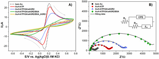 Figure 2B and Figure 3A show the impedance spectra recorded with the EIS technique for a pure gold electrode and after each stage of the modification of its surface and during the detection of the AGR2 protein, respectively. The shape of the impedance spectra in the tested measuring frequency range from 100 kHz to 0.1 Hz is identical. The EIS spectra consists of one time constant. In the range of the highest and intermediate measurement frequencies, there is a capacitive loop, while at the lowest measurement frequencies, its presence is manifested by the Warburg impedance associated with diffusion control (straight line inclined at an angle of 45° to the X-axis).