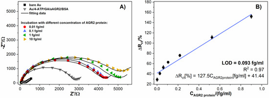 The next stage of verification of the modified screen-printed gold electrode as a potential biosensor includes subsequent incubation in diluted solution of AGR2 protein and recording the electrode response with electrochemical impedance spectroscopy (Figure 4A). Here, the charge transfer resistance (Rct) increases gradually as the protein concentration increases after consecutive incubations. This was made from 0.01 fg/mL to 1 fg/mL. Table 1 presents the resistance values with incubation.