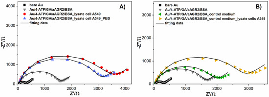 No crucial changes were observed for separate measurements of PBS and control medium. The electrodes’ impedimetric characteristic stayed practically unchanged (Figure 5). For the measurements of the mix of negative samples and lysate, representative data are presented in Figure 5A, which shows impedance changes of the gold electrode during the modification steps of the sensor and antigen detection. The substantial impedance increase was observed after anti-AGR2 antibodies were linked and BSA free-sites were blocked, confirming the presence of a densely packed protein biolayer. The incubation of the Au/4-ATP/GA/aAGR2/BSA modified electrode with cell lysate A549 resulted in successive impedance increases compared to the ready biosensor (Figure 5B). After the AGR2 protein detection from the lysate, the same electrode was flushed with water and incubated with PBS buffer to exclude unspecific interactions. The impedance decreased slightly, which might be attributed to some disorder of the structure during electrode displacement and rinsing. Most importantly, the Rct did not increase after incubation with PBS, which would indicate false positive antibodies–antigen interactions.