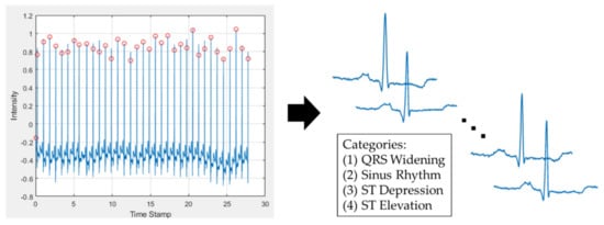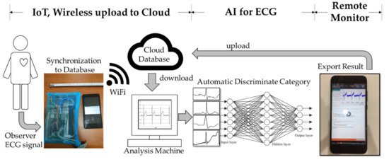 Nowadays, due to the convenience of urban life and the popularity of medical treatment, people can measure their blood pressure in supermarkets and convenience stores close to their homes. However, ECG is more important for real-time measurement of cardiac function than blood pressure. Following the awareness of this, people could easily apply an ECG device anywhere in the future. There must be a specific and popular way to meet the need in terms of such medical concerns. In general, the ECG signal must be interpreted and diagnosed by doctors with their medical expertise, even though people can use the relative machine to obtain their ECG signal. The second reason is that people do not have enough expertise to diagnose themselves at home and doctors cannot make real-time diagnoses at the same time as well. This study aims to investigate whether it is possible to obtain an ECG signal and diagnosis at any time and place. Suppose artificial intelligence (AI) algorithms are used to distinguish pre-discriminate ECG signal patterns measured at home through the Internet of Things (IoT), then people can directly obtain a preliminary report of their ECG anywhere [5,6,7]. For the achievement mentioned above, the main control factor is the signal from the ECG. ECG can be used to understand the activity of the heart and whether the heartbeat is normal and regular [8]. The diseases that doctors can detect through these waveform changes include the following: myocardial infarction, heart displacement, cardiac cystitis, arrhythmia, coronary artery insufficiency, electrolyte metabolism imbalance, atrium or ventricular hypertrophy, etc., [9].