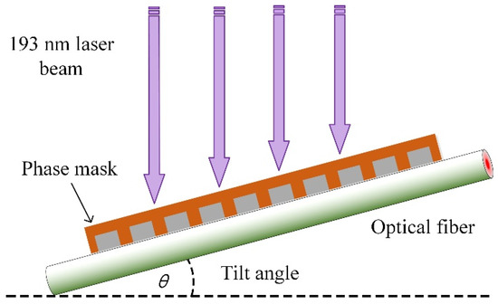 The TFBG used in the work was fabricated using the phase-mask technique (±1 diffraction order) [35], which can be seen in Figure 1. To increase the photosensitivity of the fiber core, a germanium-doped silica fiber, instead of a commercial single-mode fiber, was used for tilted grating inscription. An excimer laser with a wavelength of 193 nm, 3 mJ of power per pulse, and a frequency of 200 Hz, was used as the light source. The laser beam scanned the phase-mask during the inscription procedure to improve the quality of tilt grating. The TFBG transmission spectrum can be expressed as Equations (1) and (2) [4]: