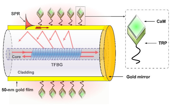In order to make a specific detection, surface functionalization for the plasmonic TFBG should be carried out. As the TRP can specifically interact with CaM, we used TRP as a bio-receptor and bonded it onto the metallic surface, as shown in Figure 2. The surface functionalization included several steps as follows: