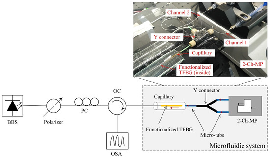 Figure 3 shows the block diagram of the experimental setup used in this work. A broadband source (1460–1560 nm) followed by an in-line fiber polarizer was the light source. A manual paddle fiber polarization controller was used to control the polarization state of the light launched into the TFBG. An optical circulator was applied to connect the TFBG to an optical spectrum analyzer, which was used to monitor and record the reflected spectra from the TFBG. The inset in Figure 2 shows the practical microfluidic system used in the experiment. The inner diameter of the micro-tube and the capillary (with a length of 5 cm) was 300 µM. Because of the custom-designed microfluidic system, the sample solution required for the experiment was only 20 µL. Additionally, a two-channel-pump was used to inject the buffer and sample solutions independently, thus making the implementation easier.