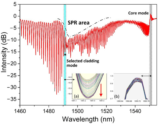 To excite SPR, a 50 nm-thick gold nanofilm was deposited on the surface of the fabricated TFBG (as shown in Figure 1) through the radio-frequency magnetron sputtered method [36]. As the fiber is a cylindrical structure, to obtain a more uniform film, the fiber was continually rotated about the fiber axis at a speed of 0.5 rad/s during the deposition process. Although we can determine the thickness of the gold deposited on the fiber surface by controlling the working time of the radio-frequency magnetron sputtered machine, we could not, one hundred percent, ensure that the gold thickness was 50 nm each time. What we could guarantee was that the gold thickness was approximately 50 nm according to our previous experience, and the SPR could be strongly excited. After that, a gold mirror was deposited, using the same method, downstream of the TFBG, making the plasmonic TFBG work as a reflection probe. The SPR excited by the TFBG can be understood when the propagation constants of the cladding modes are equal to those of the surface plasmon polaritons (SPPs), power coupling between the cladding modes and SPPs can occur, and this phenomenon is observed as a consequent reduction in the TFBG spectrum. Small changes near the metallic surface could be measured by monitoring the power changes of the cladding modes within the SPR absorption area.