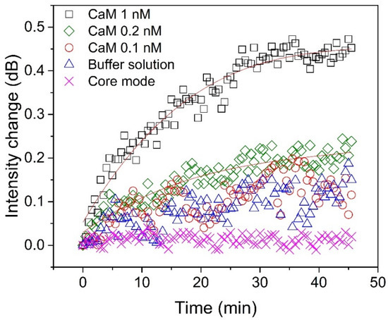 Detection of calmodulin at concentrations of 1 nM (black “□”), 0.2 nM (green “◇”), and 0.1 nM (red “○”) compared with buffer solution without calmodulin (blue “∆”). The intensity changes of the core mode (pink “X”), at 1540 nm, as it varied with time is also shown.
