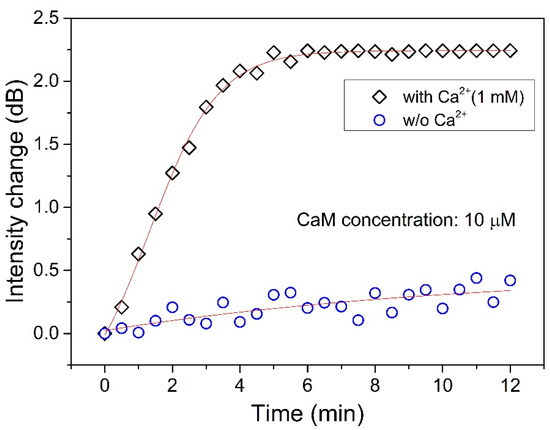 Finally, we also tested the interaction between CaM and TRP channels in solution with and without Ca2+ (Figure 7). Note that the Ca2+ concentration used in the experiment was 1 mM, as the Ca2+ concentration in the body is slightly higher than this value. We can see that even though the CaM concentration is 10 μM, the interaction between CaM and TRP was very weak (as the blue circles in Figure 5 show) if there is no Ca2+ in the solution. On the other hand, the interaction was very strong when the Ca2+ was present in the solution, as the black squares show. The change in intensity increased sharply in the first 4 min, and it reached saturation after 5 min, at which point the interaction reached equilibrium.