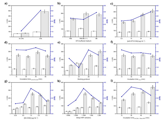 Feasibility of the immunosensor design (a), and effect of the working variables on the amperometric response provided by the developed immune platform (b–i): (b) different buffered medium for the preparation of ST2 standard solutions; (c) concentration and (d) incubation time of anti-ST2-CAb; (e) steps involved in the working protocol; (f) incubation time with ST2; (g) concentration of btn-DAb; (h) Strep-HRP dilution; and (i) incubation time of the mixture containing btn-DAb and Strep-HRP. Amperometric responses measured in the presence of 0.0 (white bars) and 1000 (a) or 500 (b–i) (grey bars) pg mL–1 ST2 and the resulting signal-to-blank ratios ((S/B), blue dots and lines).